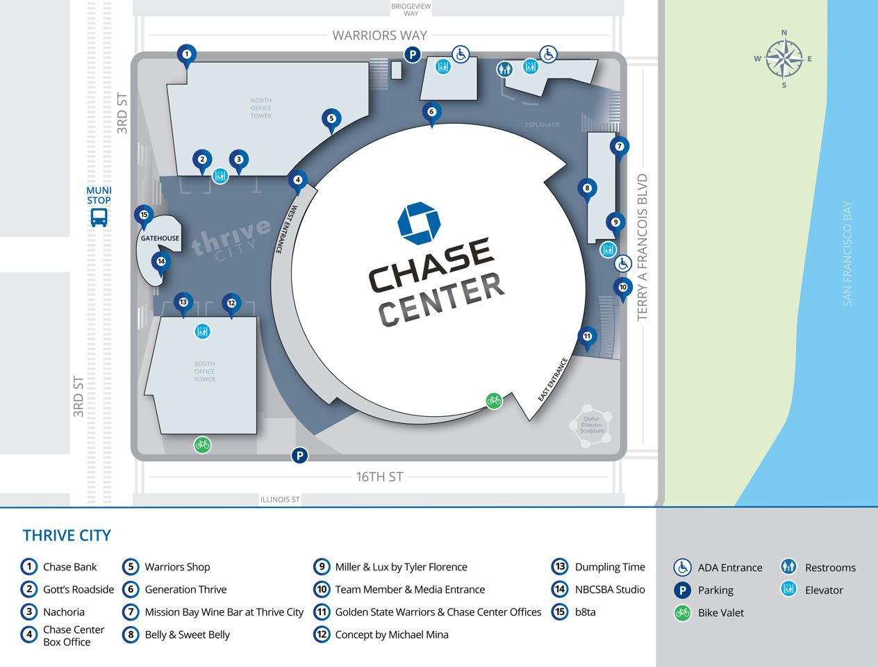 - WARRIORS WAY GARAGE (150 Warriors Way, San Francisco, CA 94158): possui 250 vagas de garagem, sendo 30 delas destinadas para pessoas com dificuldade de locomoção e fica localizado praticamente abaixo do ginásio