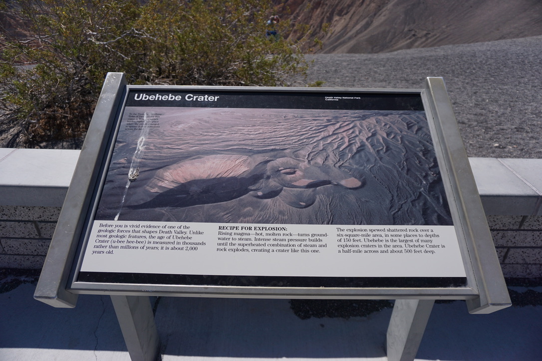 Há mais de 300 anos atrás, ocorreu uma explosão vulcânica em Death Valley, quando o magma brotando da terra teve contato com águas subterrâneas, que foram instantaneamente transformadas em vapor. Quando as cinzas da explosão se assentaram, foi possível ver que uma cratera de 180 metros de profundidade por 800 metros de diâmetro se formou. A Ubehebe Crater é bem visível a a partir da estrada asfaltada que leva até o local Quem tiver bom preparo físico e disposição, pode fazer uma trilha de cerca de 240 metros que vai até o interior da cratera. O problema é subir de volta. Há também crateras menores que ficam ao redor desta grande cratera.