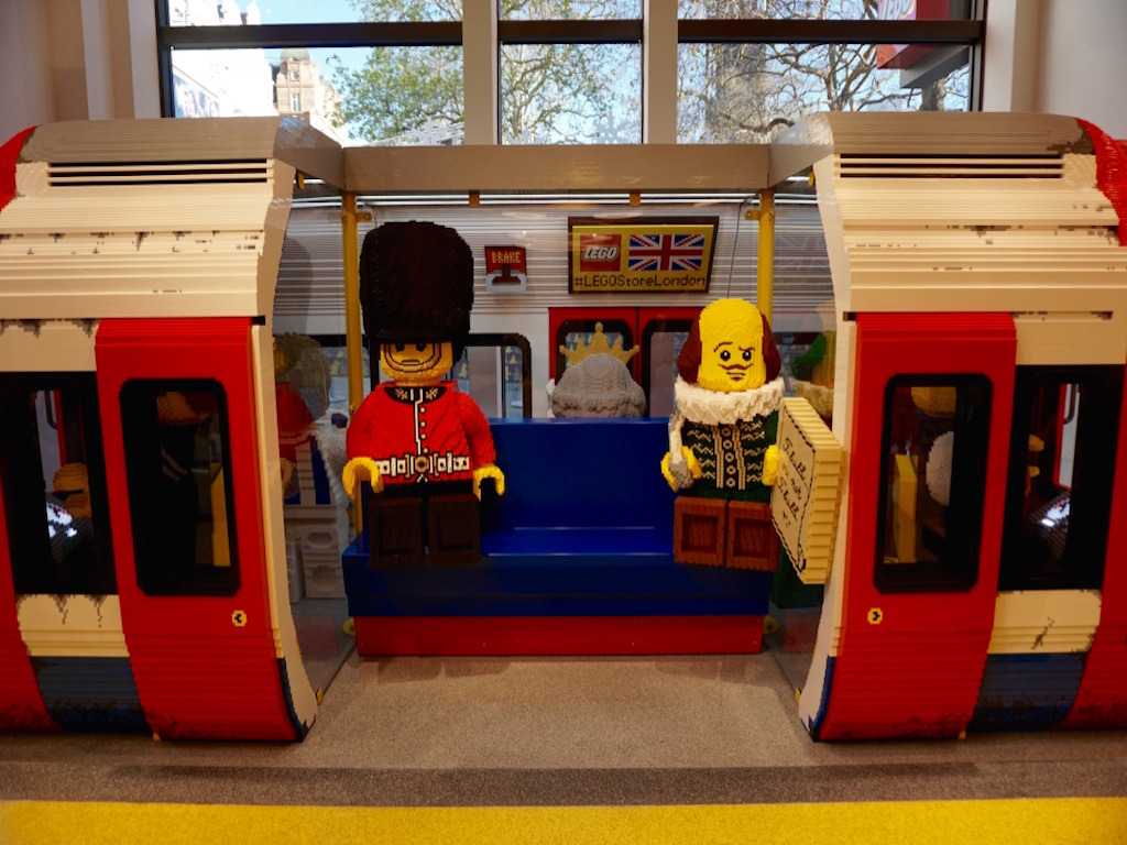 No primeiro andar, os destaques ficam por conta do metrô de Londres. Há um vagão montado com peças de Lego em que estão Shakespeare, a Rainha Elizabeth, um dos famosos guardas da Rainha, com direito a chapelão preto e tudo mais e um mapa das linhas de metrô de Londres! Ao lado do vagão, um funcionário da loja dá de presente um passaporte Lego e coloca carimbos na hora.
