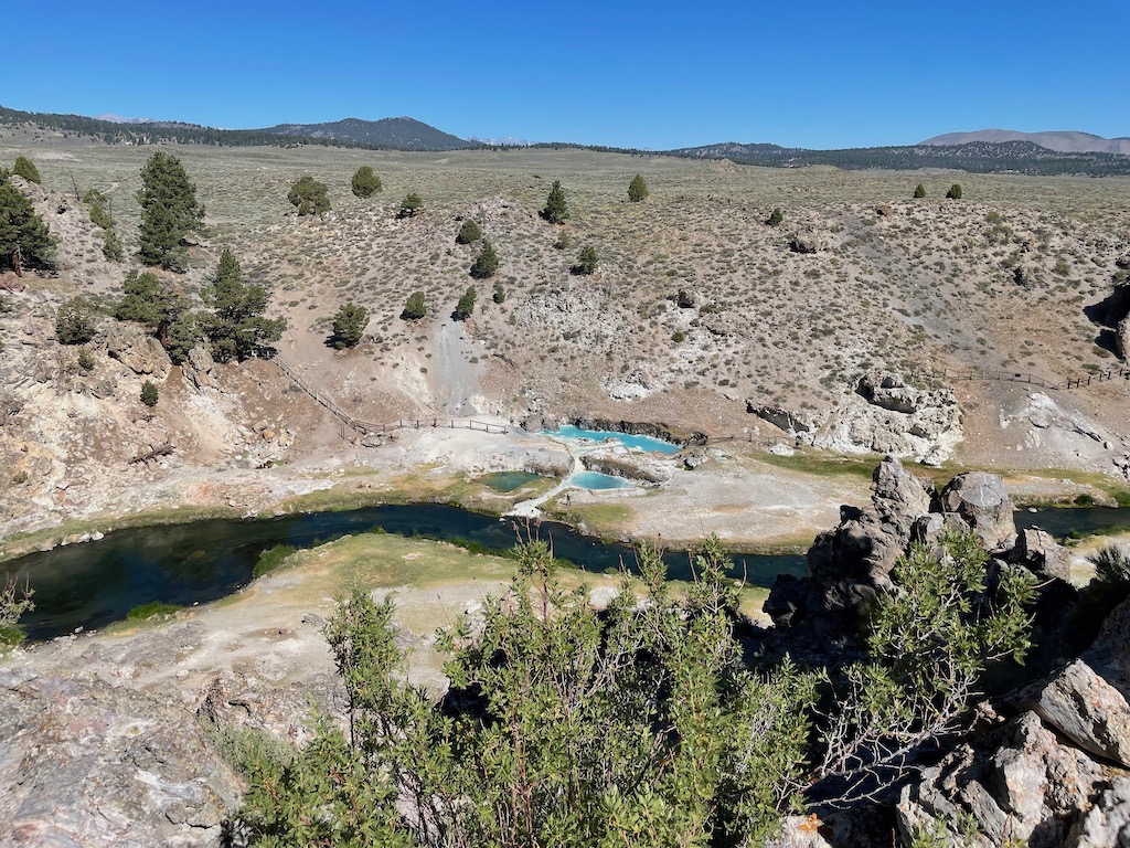 Hot Creek é um lugar para quem adora geologia e adora observar atividades geotérmicas, pois se trata de um “mini Yellowstone”. A câmara de magma quente fica a cerca de 5 km abaixo da superfície terrestre nesta área. Neste local, você poderá ver água fervente borbulhando no leito de um riacho e geysers explodido periodicamente. O vapor ao longo de Hot Creek é criado quando a água penetra profundamente no solo e entra em um complexo sistema de encanamento subterrâneo. A água é aquecida e pressurizada antes de subir à superfície da terra. Terremotos podem causar erupções repentinas de gêiseres e aparições noturnas de novas fontes termais em Hot Creek. As temperaturas da água podem mudar rapidamente e, portanto, é proibido entrar na água. O local é relativamente pequeno e, por isso, pode ser visitado com rapidez. Logo no estacionamento, você terá uma visão do alto, que é uma das mais bacanas do local. Pode seguir por uma pequena trilha, a Hot Creek Interpretive Trail, para ter uma visão mais próxima, embora seja proibido se aproximar do local com águas azul royal borbulhantes. Siga para a direita para ter uma bela vista do Hot Creek, o riacho que serpenteia a região. Dica: um trecho da estrada que leva até o local não é pavimentada, por isso, vá devagar e tenha cuidado.