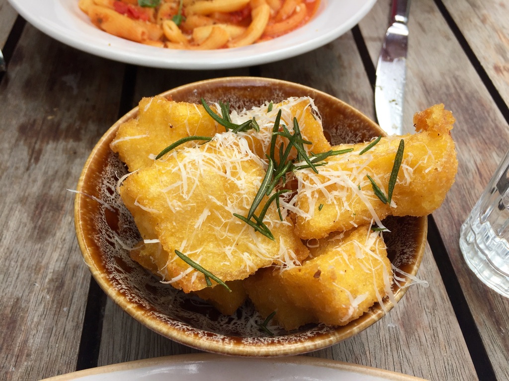 - 7. JAMIE’S ITALIAN: Pratos bem gostosos no restaurante italiano do famoso chef britânico Jamie Oliver. Já comemos em várias unidades do restaurante dentro e fora de Londres. A polentinha frita é uma delícia! Leia mais: Jamie’s Italian: restaurante italiano de Jamie Oliver em Londres