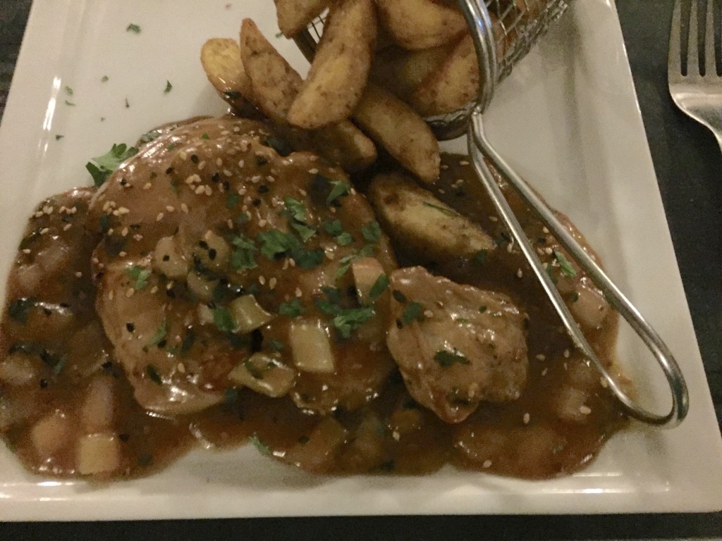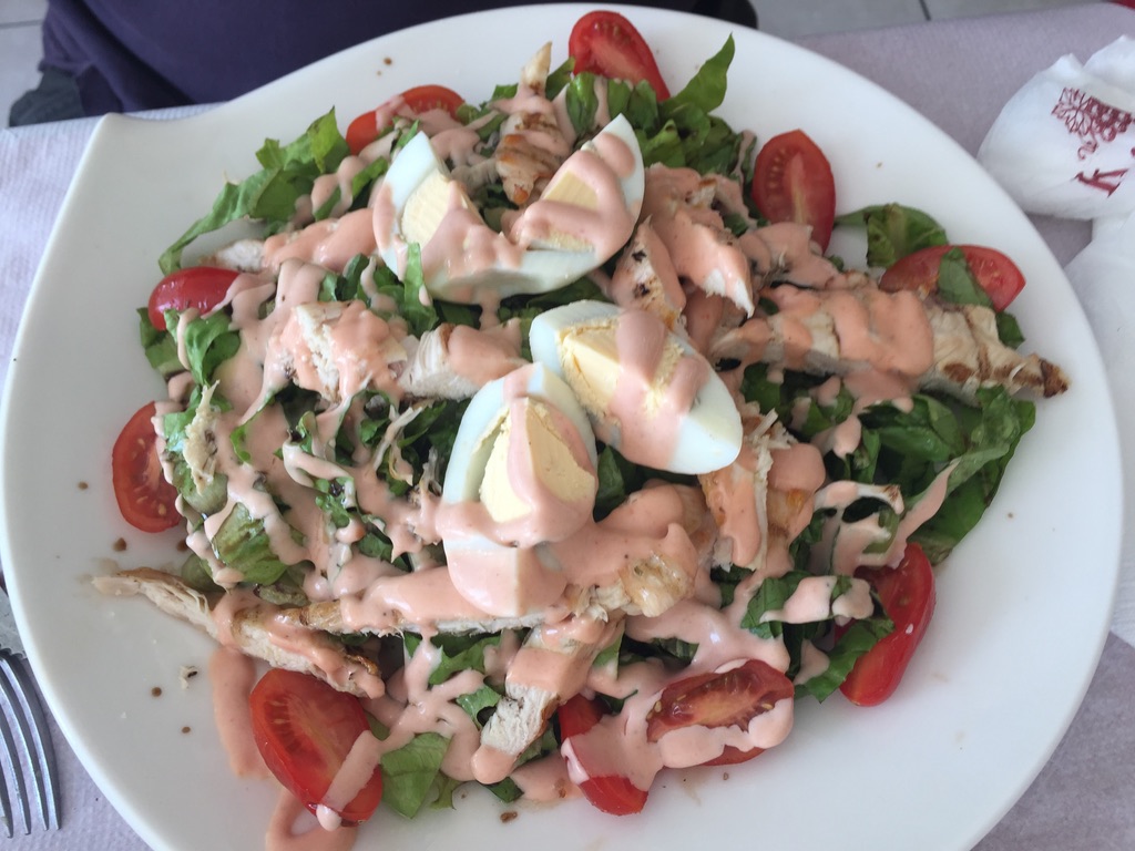 Kelari é uma taverna grega muito simpática que oferece pratos tradicionais deliciosos em um ambiente super tranquilo. Ela fica perto da cidade de Fira, bem no meio da ilha. Estávamos famintos, prontos para nosso último almoço em Santorini. O pãozinho com azeite de cortesia abriu nosso apetite. Pedimos berinjela empada para começar e depois uma salada caprichadíssima, além de Souvlaki (espetinho grego) com fritas.
