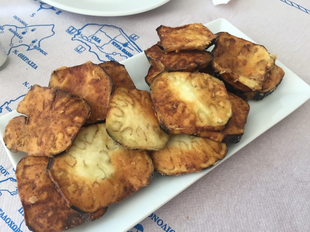 Thalami é uma taverna grega no centro de Oia, com um salão interno e também mesas na área externa para aproveitar o clima grego. Como uma tradicional taverna grega, o cardápio está recheado de pratos tradicionais deliciosos! Nós pedimos uma moussaka, a “lasanha grega”, feita com deliciosas fatias de berinjela e abobrinha e uma deliciosa salada grega, com o objetivo de nos refrescar naquele dia extremamente quente na ilha.