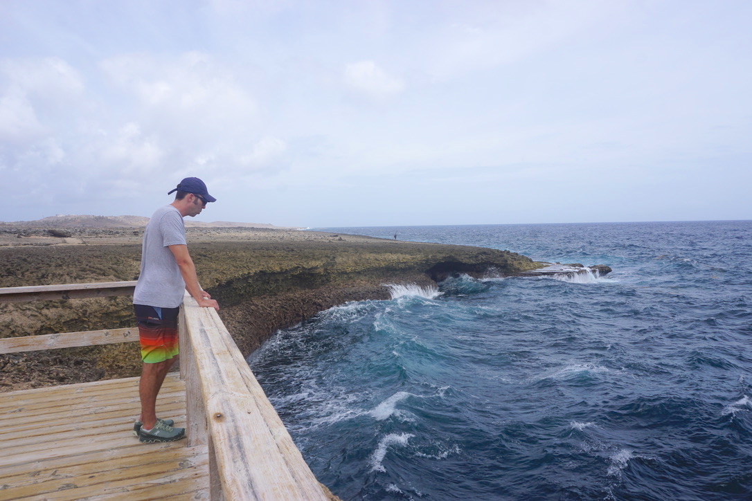 Depois de contemplar a vista da plataforma, desça as escadas de pedra em Boka Wandomi, atravesse a enseada de areia e depois suba de volta pelo penhasco oposto. Uma vez no topo, siga o caminho para uma rampa de madeira que desce para outra plataforma onde você pode ver ondas quebrando através do arco da ponte natural.