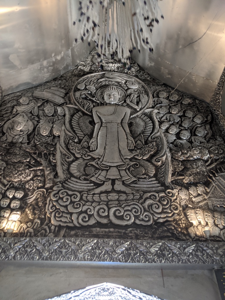 Observando no detalhe, é possível ver uma grande variedade de decorações nos painéis de prata dos dois lados do templo, com esculturas em prata incrivelmente detalhadas exibindo cenas e momentos-chave da vida de Buda. Há também figuras da vida rural, mitologia, animais do horóscopo chinês, entre outras. Embora não seja prata pura, mas uma liga de alumínio e prata, ela parece bem real e lindamente trabalhada.