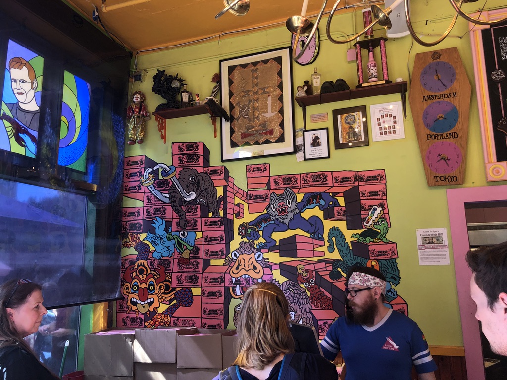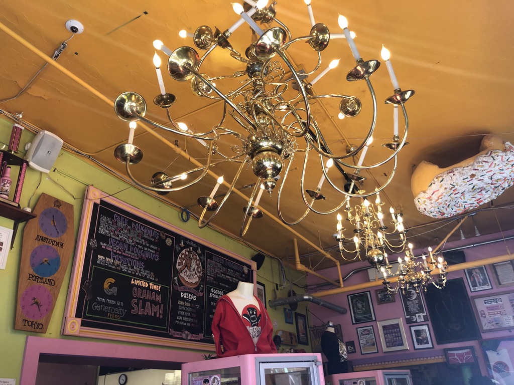 Nós conhecemos a loja original do Voodoo Doughnut no centro de Portland e, inicialmente, ficamos bem assustados com o tamanho da fila. Mas, depois de fazer um almoço gostoso em uma cervejaria local, resolvemos encarar. E não nos arrependemos! A fila demorou cerca de meia hora, mas nós aproveitamos para tirar fotos da loja e ver os detalhes da decoração maluca do local.