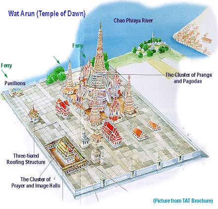 É possível subir um caminho limitado pelas escadas íngremes do ponto principal, que oferece uma vista do rio Chao Phraya. Esses degraus íngremes levam aos dois terraços que formam a base do Prang. Os pavilhões na primeira plataforma contêm estátuas de valor inestimável do Buda nos estágios mais importantes de sua vida. No segundo terraço, quatro estátuas do deus hindu Indra ou Erawan, seu elefante de 33 cabeças, ficam de guarda.